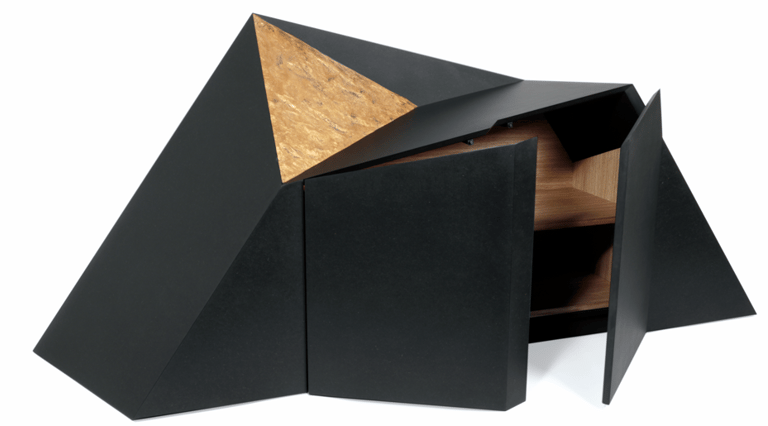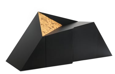 Meuble en Valchromat noir avec des panneaux plaqués chêne à l'intérieur. La surface triangulaire est ornée de feuilles d'or 23 carats.