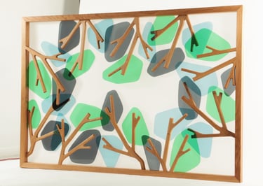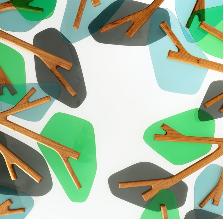 Cherchant à symboliser la canopée que l'on peut observer au cœur d'une forêt. Les couleurs vives que le plexiglas peut offrir et sa transparence, ajoutent une touche contemporaine et lumineuse, rappelant la lumière filtrée à travers les feuilles et le jeu des ombres et des lumières dans la canopée.
