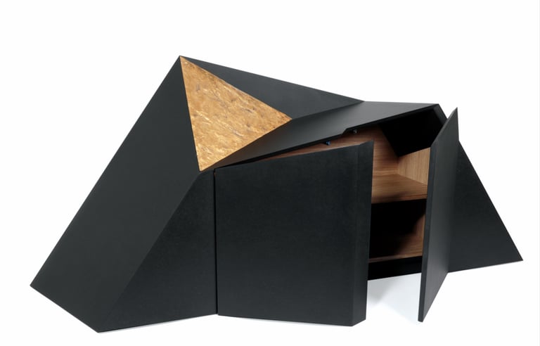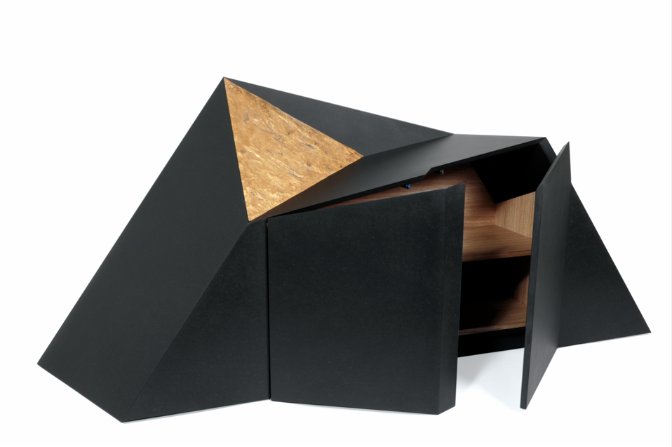 Meuble en Valchromat noir avec des panneaux plaqués chêne à l'intérieur. La surface triangulaire est ornée de feuilles d'or 23 carats.
