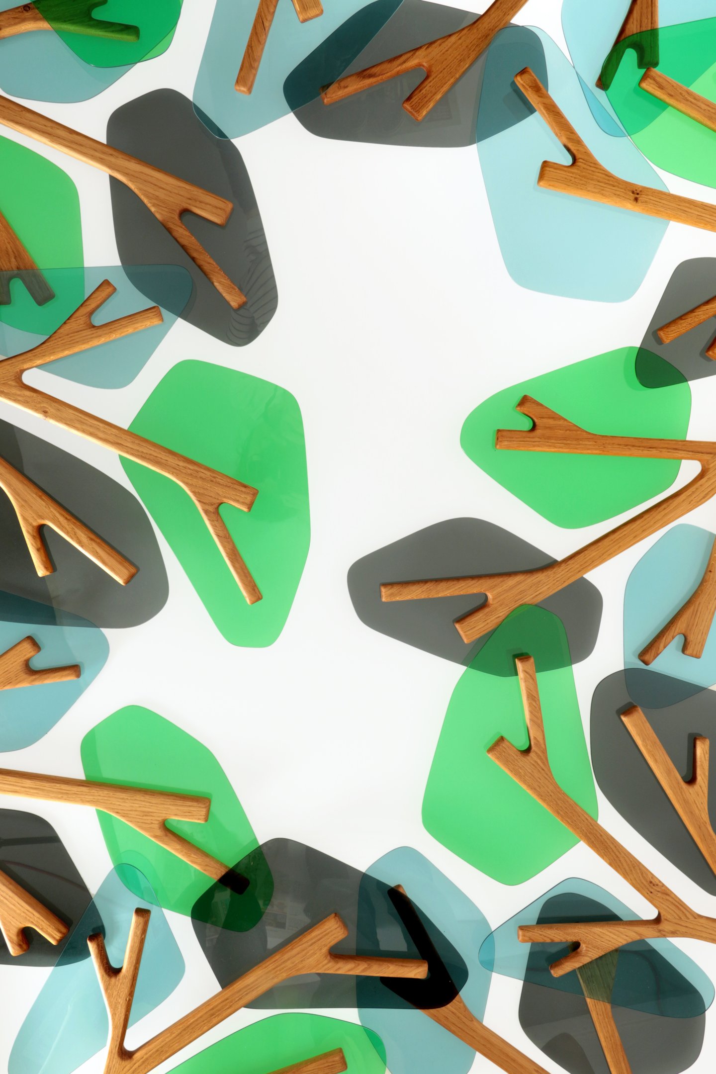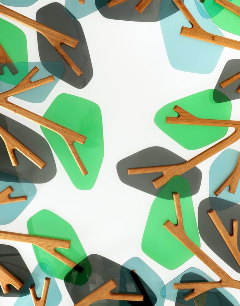 Cherchant à symboliser la canopée que l'on peut observer au cœur d'une forêt. Les couleurs vives que le plexiglas peut offrir et sa transparence, ajoutent une touche contemporaine et lumineuse, rappelant la lumière filtrée à travers les feuilles et le jeu des ombres et des lumières dans la canopée.