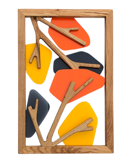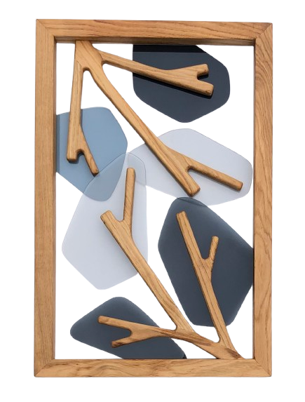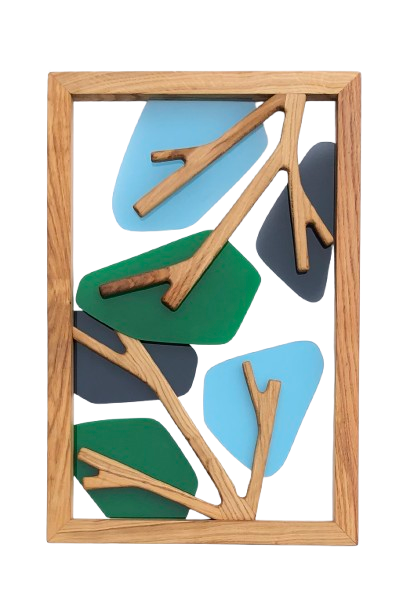 Ensemble de quatre tableaux, chacun évoquant une saison, mêlant le chêne massif des Vosges au plexiglas teinté pour une harmonie entre matière naturelle et transparence colorée
