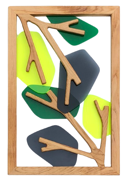 Tel une photographie monochrome, ce tableau associe la profondeur du chêne massif teinté de noir à la transparence éclatante d’un plexiglass vert fluo. Un nuancier de gris en plexiglass vient compléter l’ensemble, ajoutant des nuances délicates qui enrichissent la perception visuelle. Subtilement intégré, un ruban LED introduit un jeu de lumière supplémentaire, révélant les textures et les contrastes avec intensité.